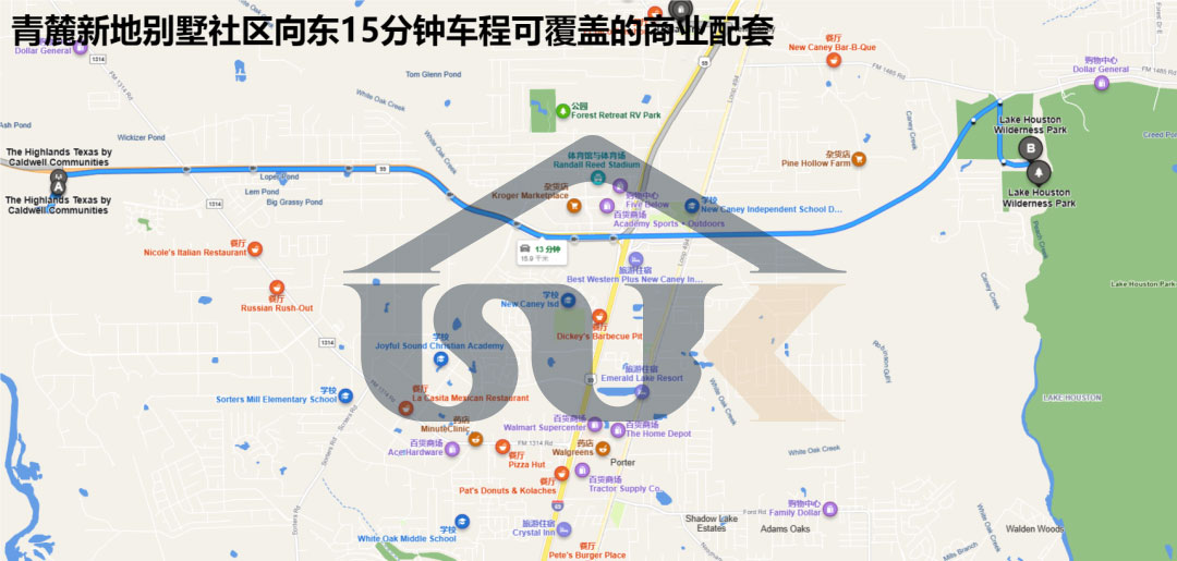 The Highlands青麓新地别墅社区位于休斯顿北部,伍德兰地区以东的蒙哥马利郡。社区周边交通便利,紧邻99号公路和1314号公路,交通便捷。40分钟车程内可达伍德兰地区、乔治布什洲际机场及休斯顿市中心,居民驾车出行或通勤十分方便快捷。 02/生活配套齐全 社区周边2英里内有近20家商业场所,20分钟车程内可覆盖十几家商超、购物中心、餐饮、药店、健身房、美容会所等休闲场所,居民日常购物休闲有众多选择,便捷的文娱生活触手可及。