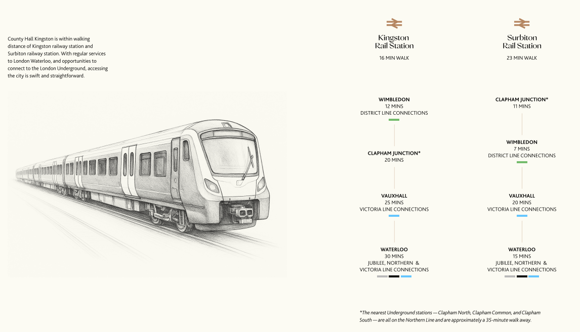 County Hall Kingston金斯顿澜庭的交通网络覆盖全面,无论是通勤至伦敦市中心,还是出行至机场、周边城市,都极为便捷: